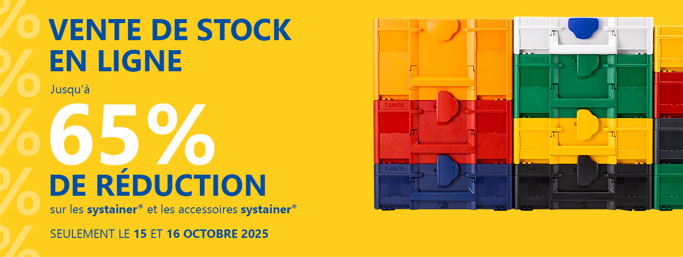 À la vente de stock en ligne Systainer³ sont proposés des articles de fin de série, systainer® T-Loc, systainer® Classic-Line, Systainer³ ainsi que des accessoires autour du systainer®.