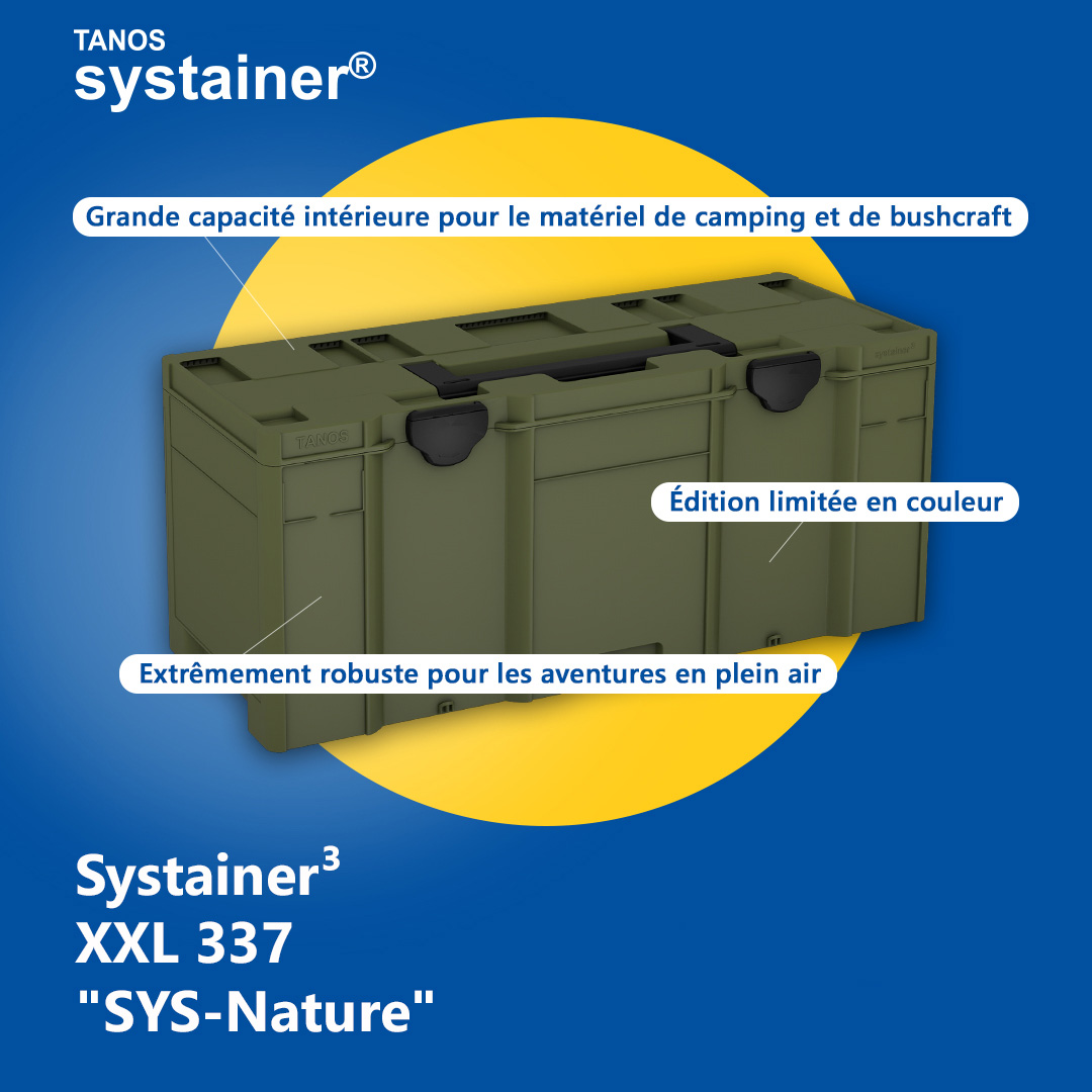 Avec le Systainer³ L 187 "SYS-Nature" en vert olive, tu es aussi bien organisé à l'extérieur qu'à l'atelier. Grâce à sa construction robuste et à son système d'accouplement bien pensé, il est le compagnon idéal pour tous, qui ont des projets en extérieur, que ce soit pour le bushcrafte, le camping, la pêche ou la randonnée. Ses couleurs discrètes s'intègrent parfaitement dans la nature. Que peut-on y mettre ? Tout ce dont tu as besoin pour ton aventure dans la nature : Réchaud de camping, cartouche de gaz, set de premiers secours, lampe de poche, Multitool, cafetière, ravitaillement et bien plus encore.
