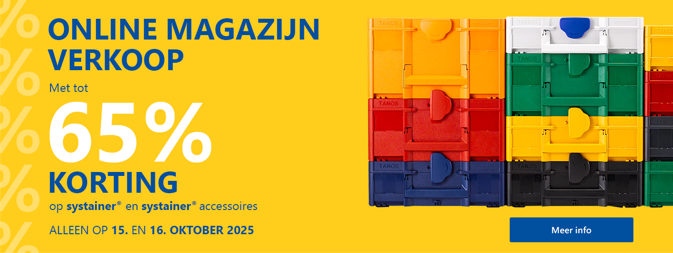 De virtuele schappen van onze online shop staan vol met ons grote systainer®-assortiment. U vindt er alles van de beproefde systainer® T-Loc tot de nieuwe generatie systainers³. Alle systainers® hebben het betrouwbare T-Loc-slot en zijn compatibel met de Festool systainer®. Blader door de systainer®-accessoires en ontdek de systainer®-inzetstukken (dekselinzetstukken/basisinzetstukken) en complete systainer®-sets. U vindt er ook informatie over systainer®-aanbiedingen en de voorraadverkoop. Rechtstreeks van de fabrikant TANOS en uit eerste hand.